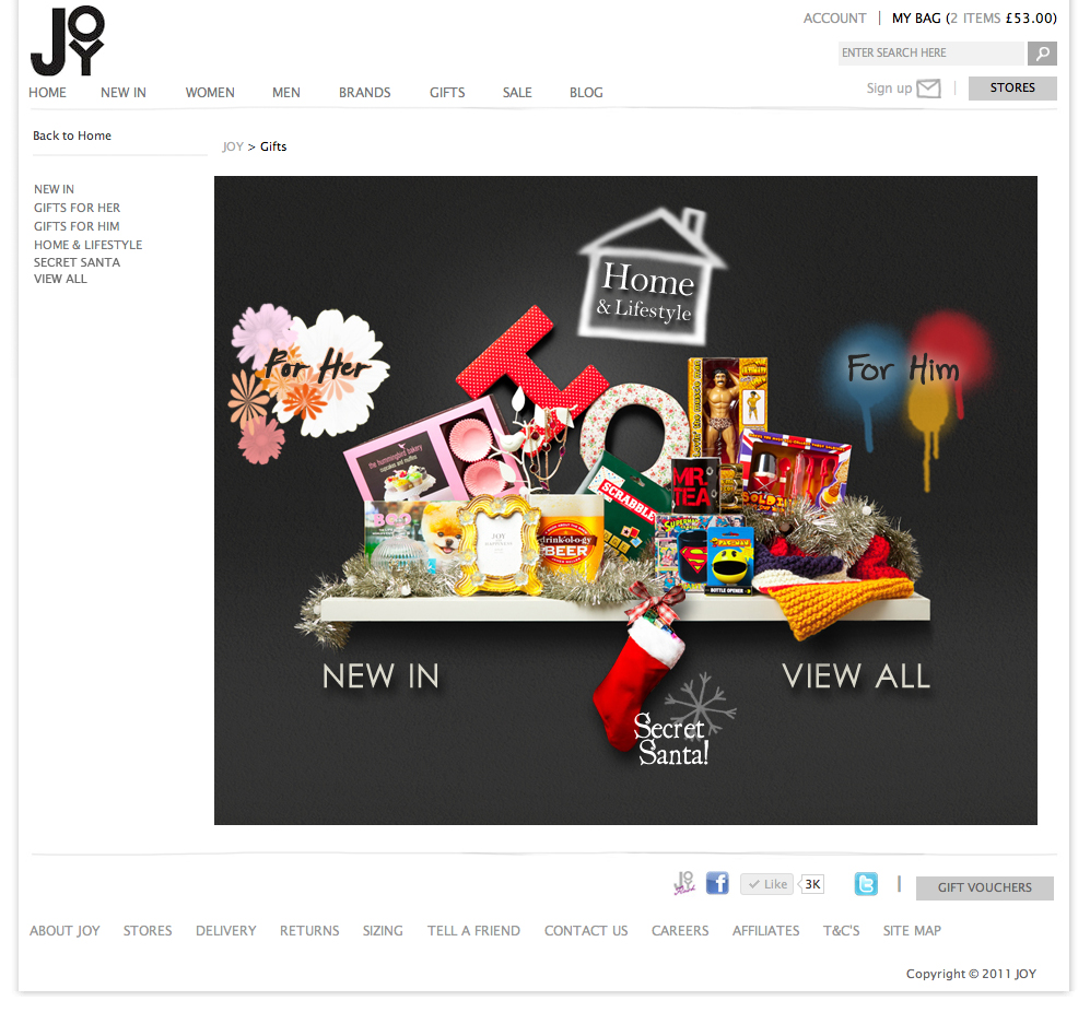 For Valentine's JOY asked it's followers to submit messages to their Valentine's and the best won a prize. I was responsible for building the competition landing page, which contained a gallery of all the entries submitted. I published all the entries (which were jpgs hosted to our server) and we encouraged users to share their 'love heart' via social media.