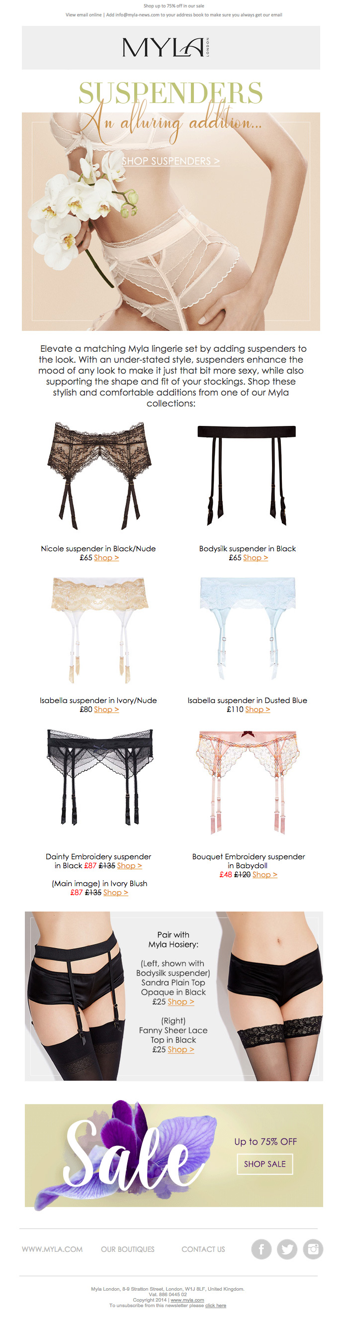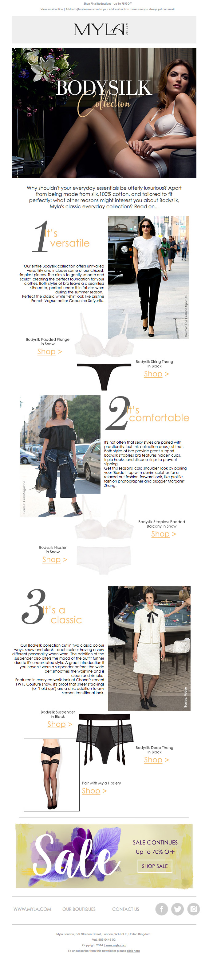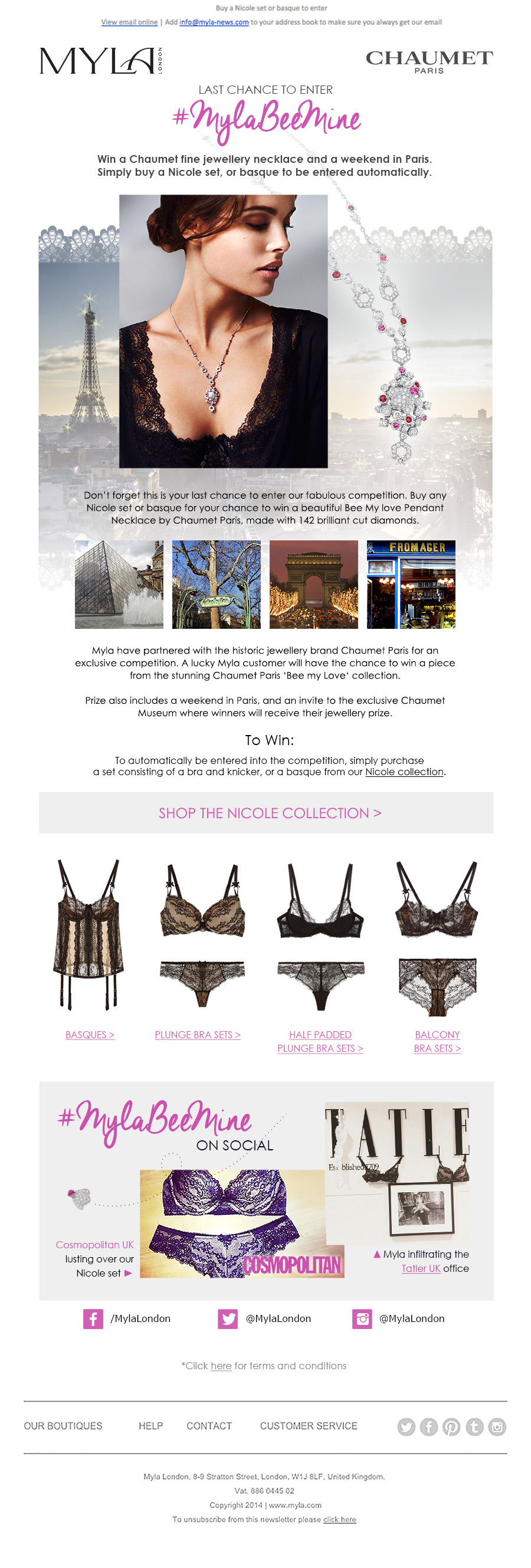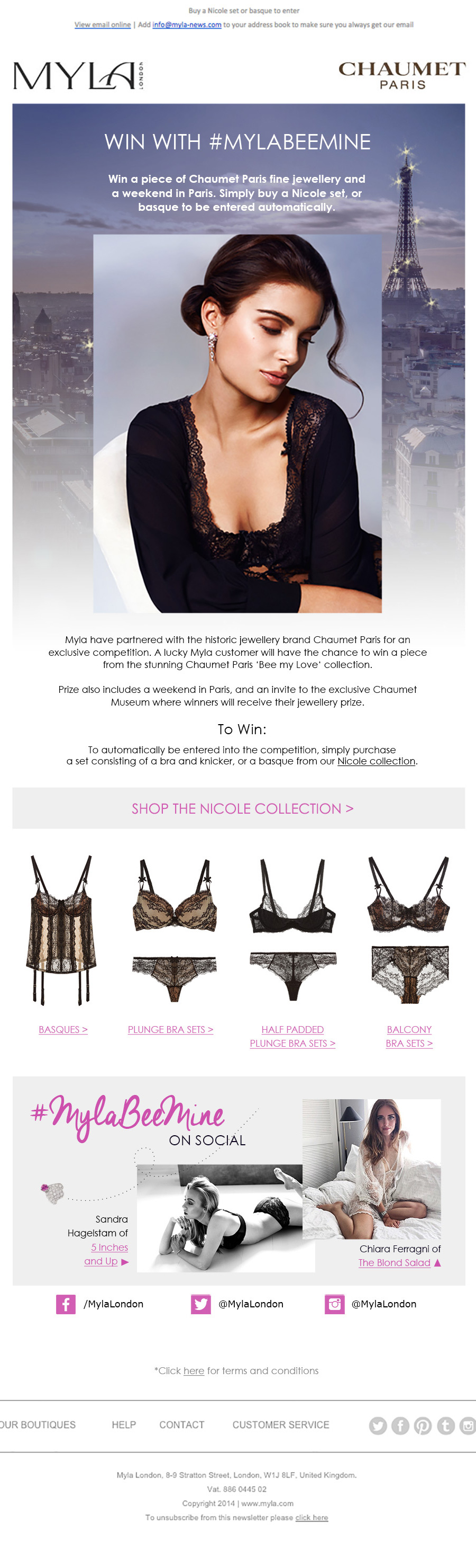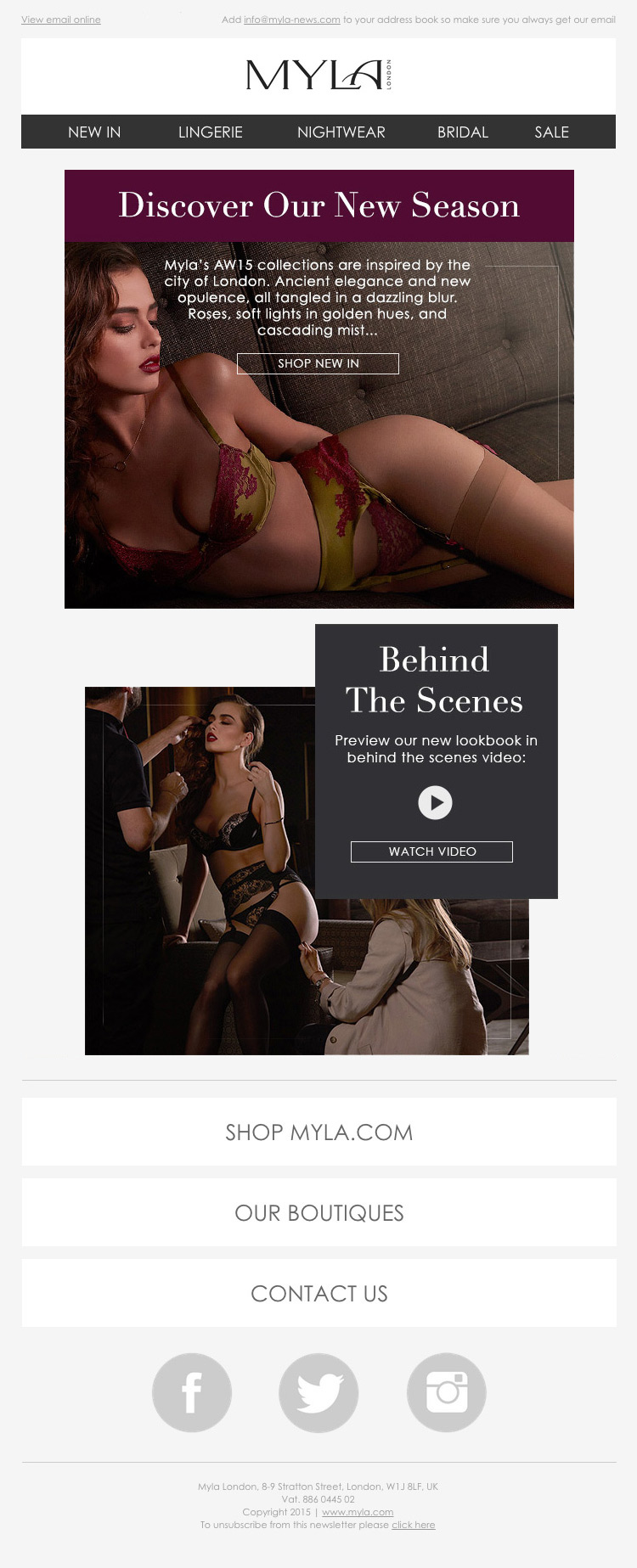www.myla.com. At the beginning of each season I was responsible for planning content for the entire season (taking into account when pieces would be available in stores, consider what was happening seasonally, etc). This dictated all the digital content which included weekly homepage updates, a responsive email newsletter, digital partnership promotions, competitions and social media assets.